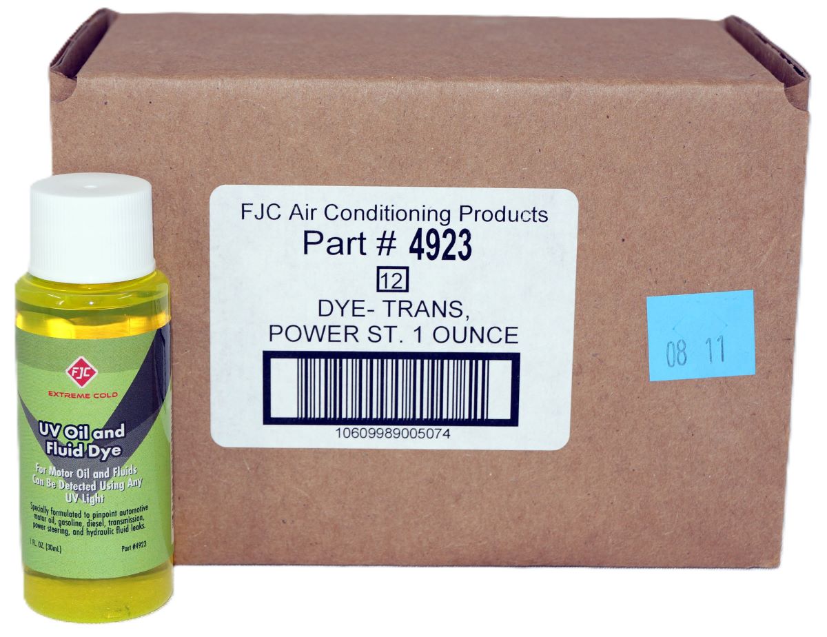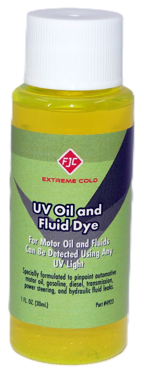 Universal dye specially formulated to pinpoint car oil leaks, transmission leaks, fuel leaks, and power steering fluid leaks.