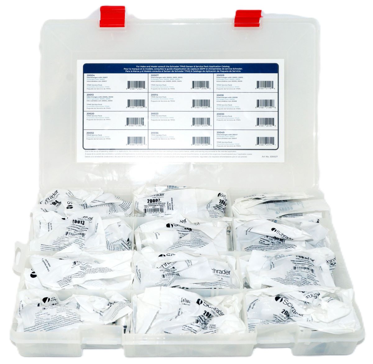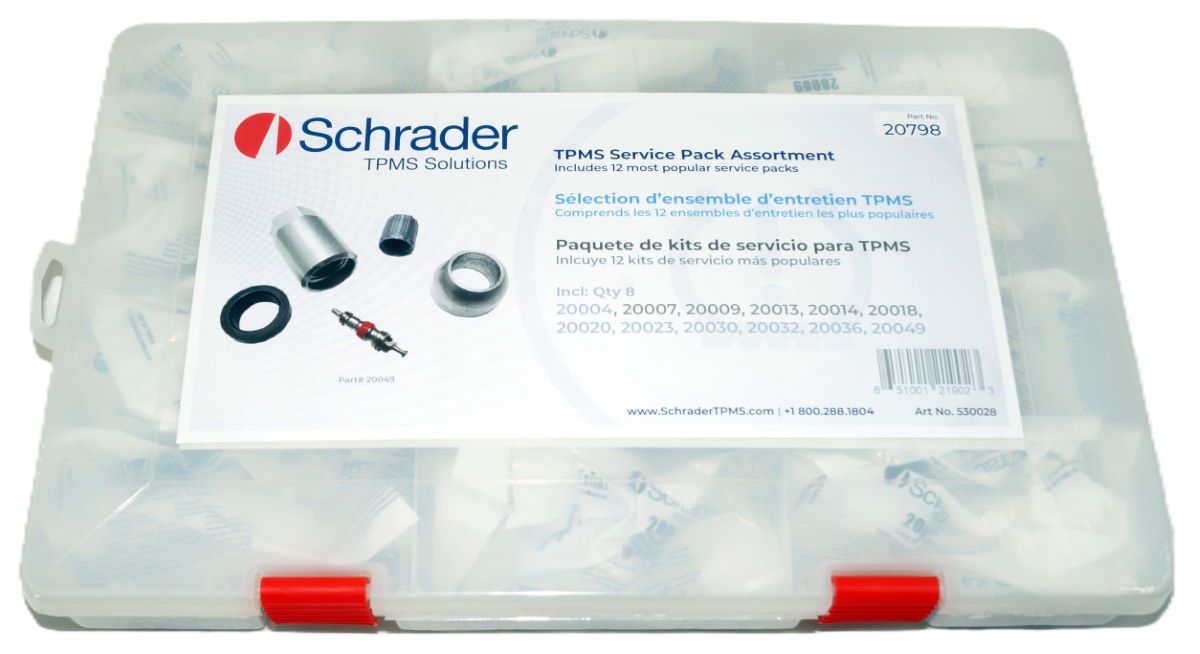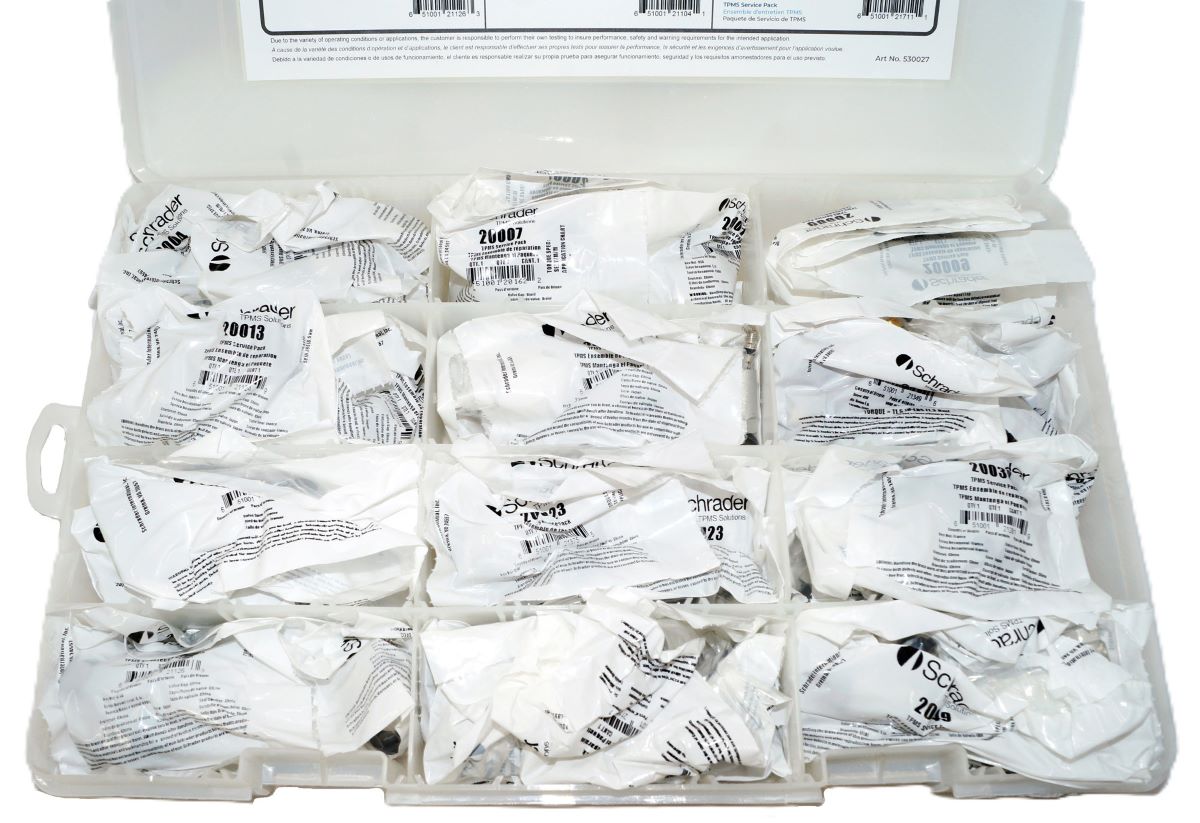 TPMS Service Pack Assortment Kit - 1 Plastic Tackle Box containing 8 units of Schrader's 12 most popular Service Packs (20018, 20032, 20004, 20013, 20020, 20030, 20007, 20014, 20036, 20023, 20009, 20049)