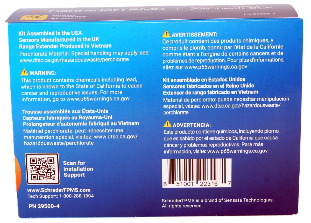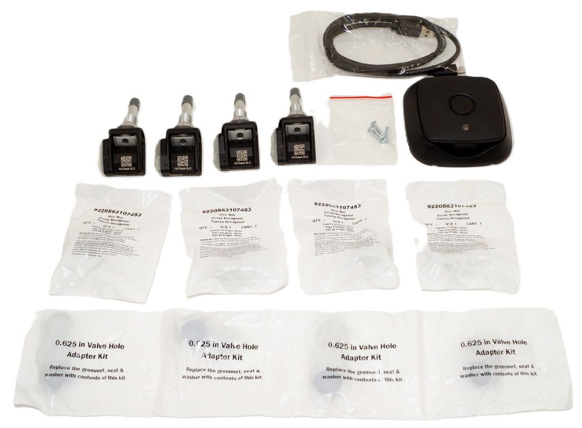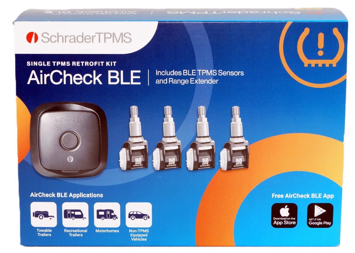 Introducing Schrader's latest innovation, AirCheck BLE, the ultimate solution for tire pressure monitoring for towable trailers, recreational trailers, motorhomes, and passenger cars without factory TPMS. Utilizing advanced Bluetooth Low Energy (BLE) technology, AirCheck BLE provides real-time alerts about tire pressure, temperature, and battery status, even when the app is running in the background. Experience the ultimate in tire safety and convenience with AirCheck BLE. Stay informed with real-time updates on tire pressure, temperature, and battery status for all connected sensors, ensuring you receive timely alerts and can take immediate action when needed. Enjoy an intuitive and user-friendly interface that makes monitoring and managing your tire pressure a breeze. Seamlessly integrate with your vehicle's systems through Android Auto and Apple CarPlay, giving you convenient access to tire pressure information and alerts right from your app dashboard. PN 29500-4: AirCheck BLE TPMS Retrofit Kit with 4 x BLE sensors and 1 BLE transceiver with charging cable.