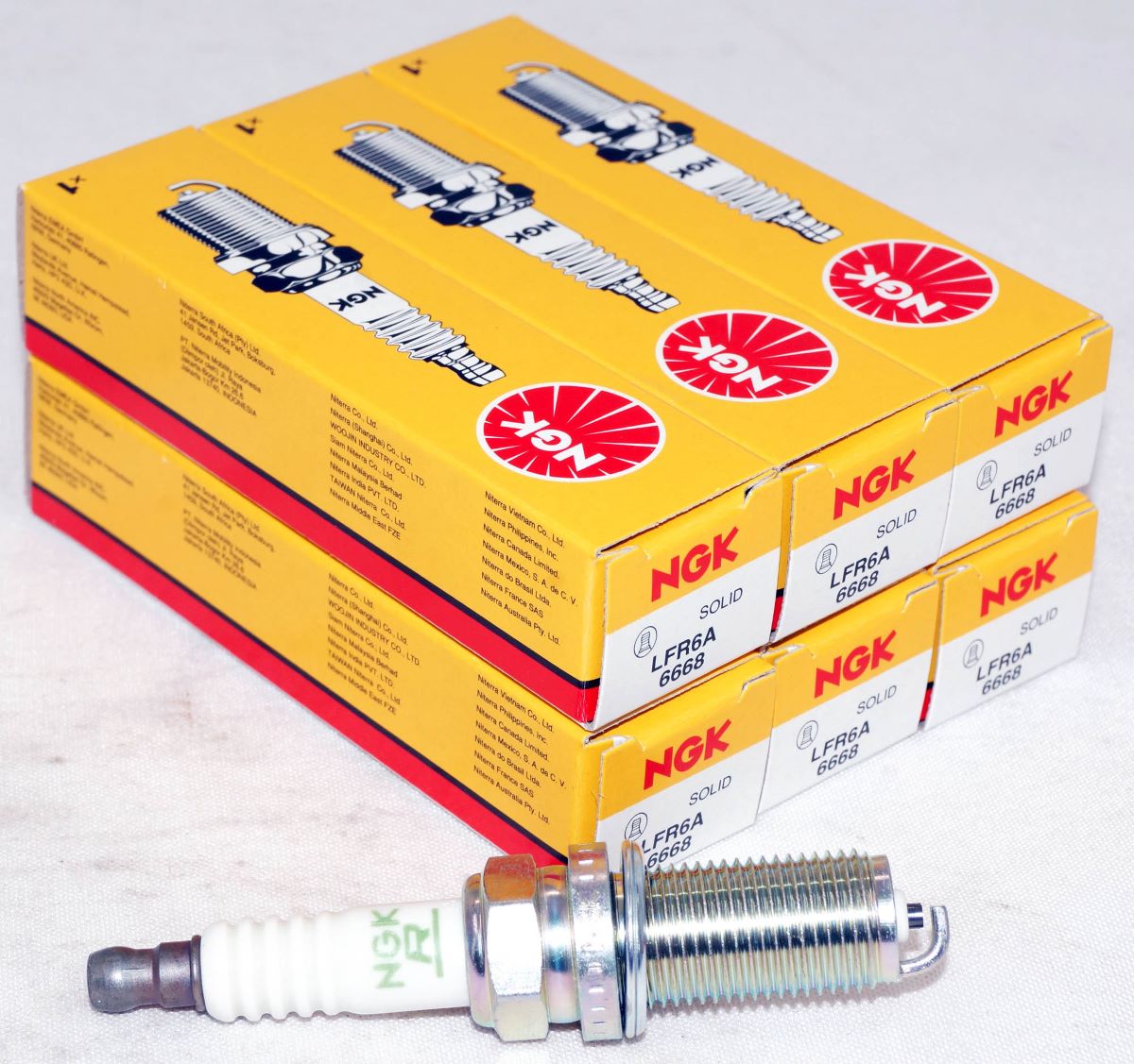 Set of 6 NGK 6668 LFR6A V-Power Spark Plugs. NGK V-Power plugs feature a unique v-cut in the center electrode that directs the spark to the edge of the electrode, helping the spark develop more rapidly, increasing ignitability and reducing quenching.